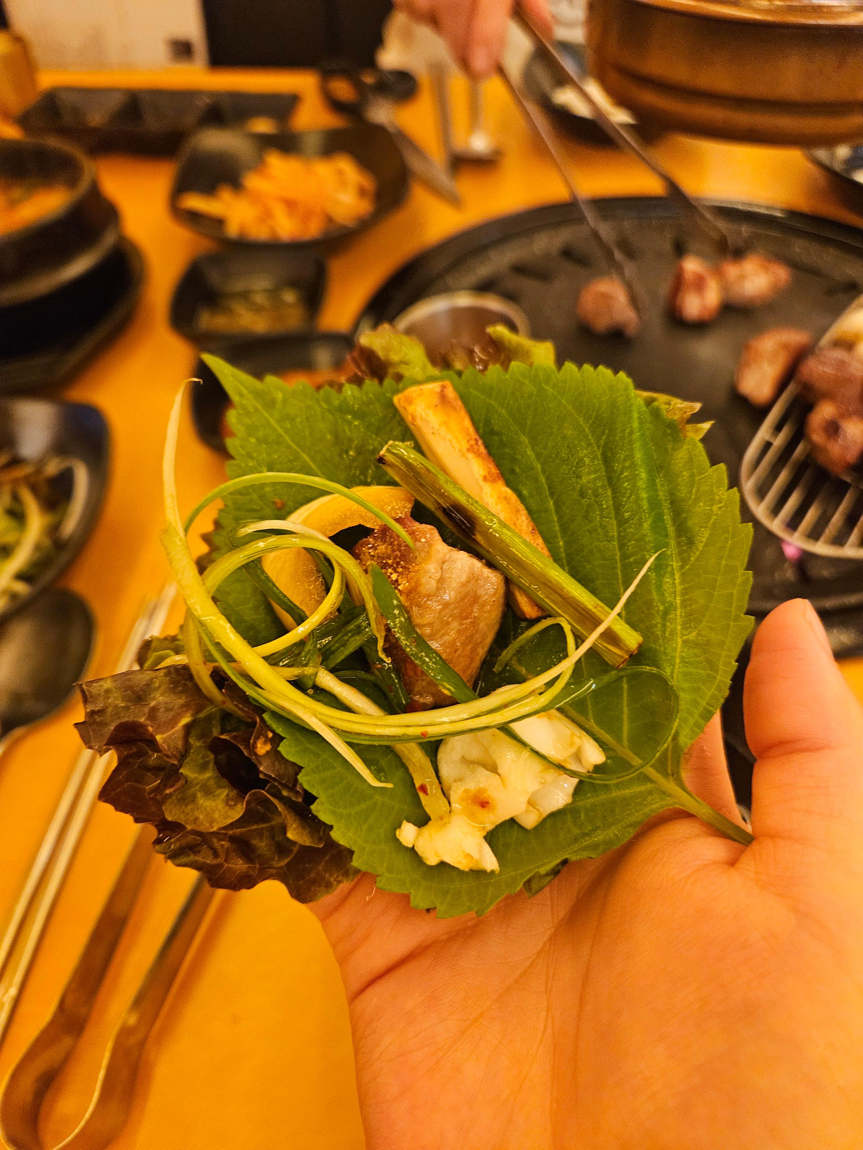고기는 역시 쌈 싸서 먹는게 국룰이죠. 서로 사이좋게 한입씩 나눠먹기~