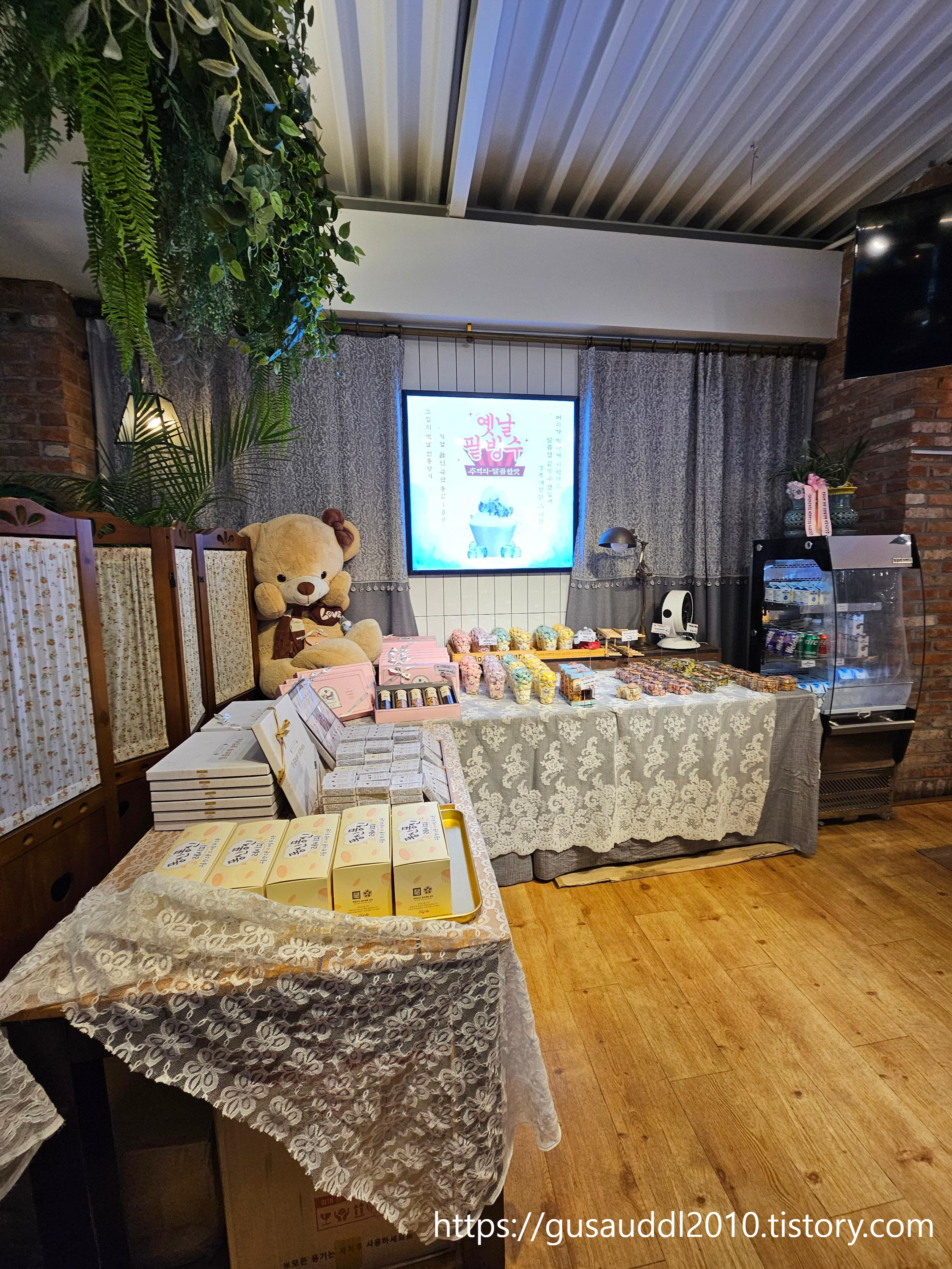 한켠에는 응원 캔디 초콜릿류, 머랭쿠키랑 쫀득쿠키도 예쁘게 포장해서 진열해놓으셨더라고요.